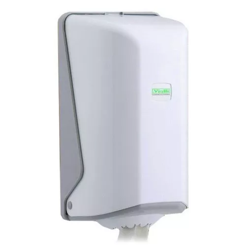Vialli tekercses kéztörlő adagoló. 14 cm átmérőjű belsőmag adagolású papír kéztörlővel használható. Az adagoló nyílása tépőfogakkal van ellátva, így perforált és perforáció nélküli papírral is használható.