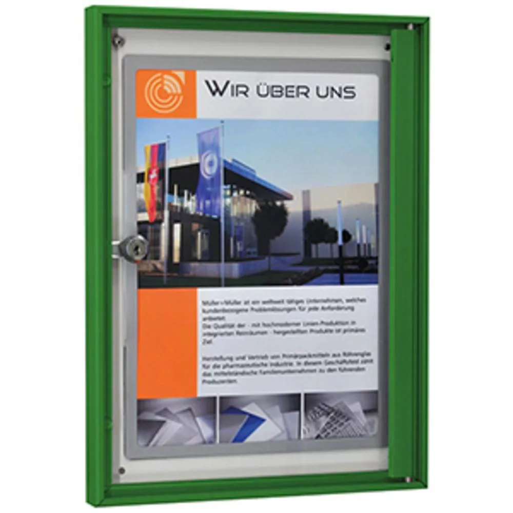 Vitrin, széxméxma 280x27x380 mm, 1xdin a4, zöld alumínium profilok, esg üveg, fehér hátlap, mágneses.