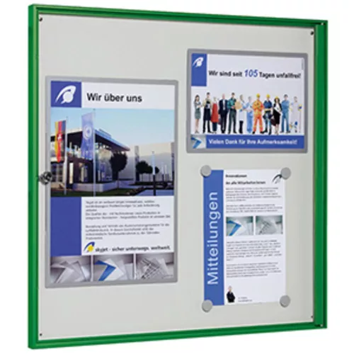 Vitrin, széxméxma 725x27x700 mm, 6xdin a4, zöld alumínium profilok, esg üveg, fehér hátlap, mágneses.