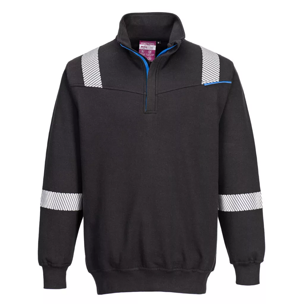 Lángálló, antisztatikus alapanyagból készülő, kiváló minőségű pulóver speciális munkakörülményekre. A ruhadarab jellemzői közé tartozik a cipzáras gallér bordázott szegély és mandzsetta, így kényelmes és könnyen viselhető.