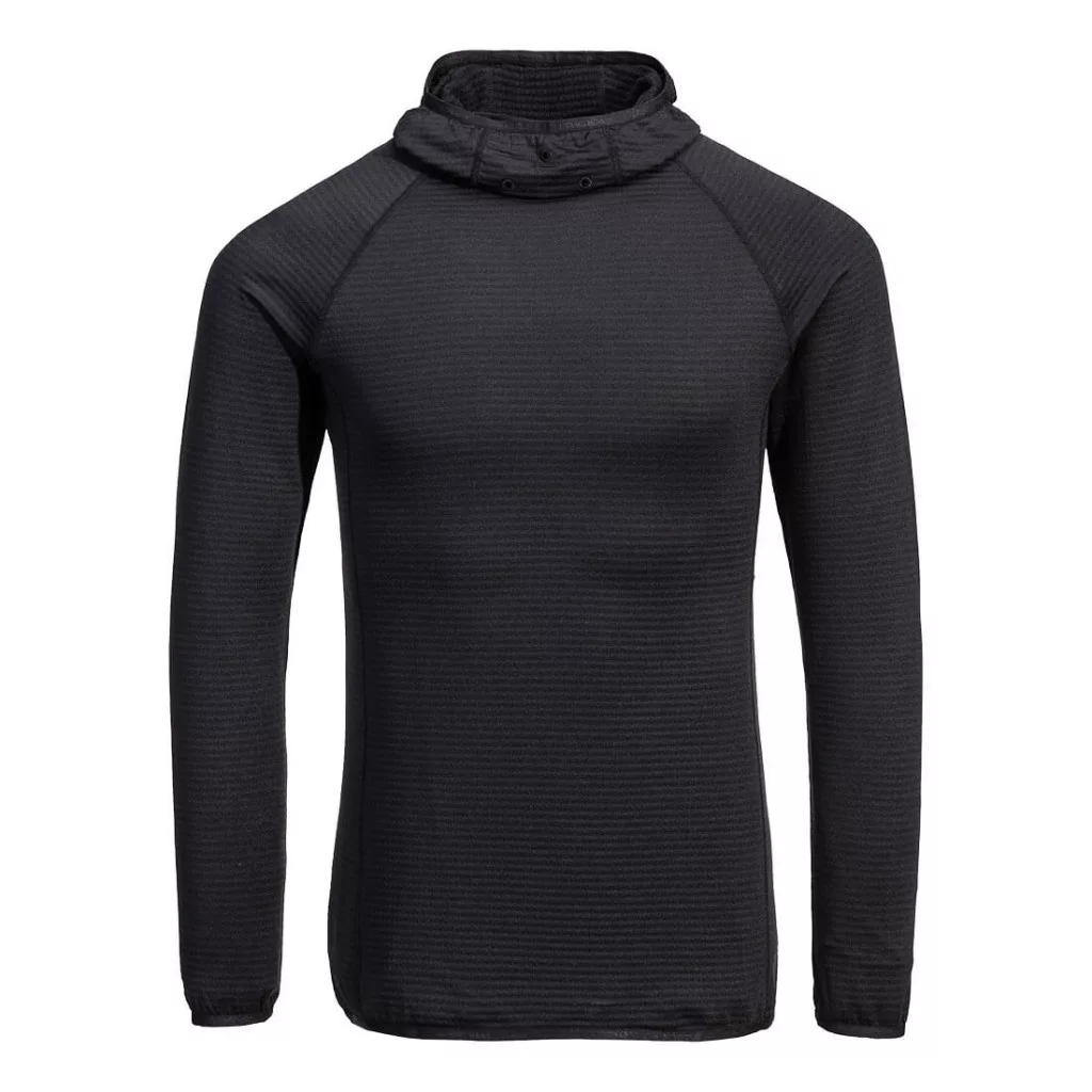 A kapucnis Baselayer sima kötött anyagból készült, a belső felületén waffle fleece anyaggal, amely melegséget biztosít, ugyanakkor nedvességelvezető és légáteresztő. Antibakteriális bevonatot alkalmaznak a szagok és a baktériumok szaporodásának megakadályozására. Meghosszabbított kapucni és nyak, légzőnyílásokkal a kényelemért. A kapucnis pulóver lapos varrásokkal rendelkezik, amelyek a vállaktól távolabb helyezkednek el, hogy ne irritálják a bőrt