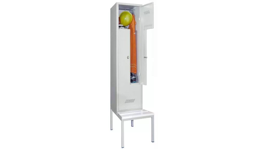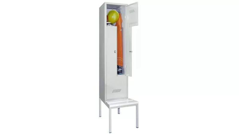 Z-öltözőszekrény, földalatti pad, bükk lécek, 2 rekesz, széxméxma 400x500/800x2150 mm, kifordítható zár, ral 7035