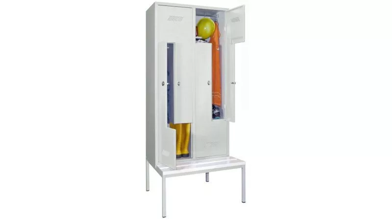 Z-öltözőszekrény, földalatti pad, bükk lécek, 4 részes, széxméxma 800x500/800x2150 mm, forgózáras, ral 7035