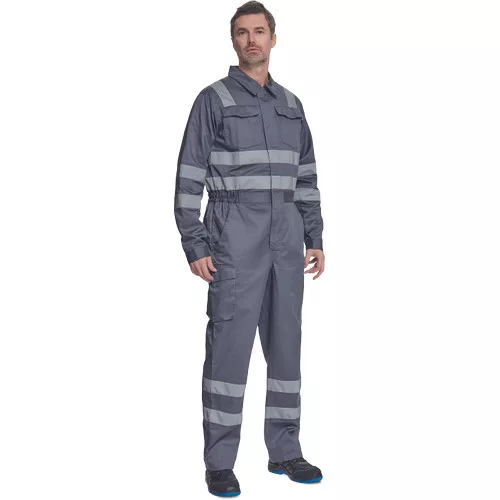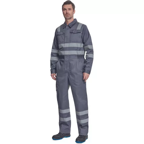 • férfi overall fényvisszavető csíkokkal • 5 cm széles csíkok a test körül • 7 cm széles csíkok a lábak körül • hajtókával fedett cipzár • 2 zseb az oldalán, 1 érmezseb • 1 multifunkciós oldalzseb a lábon • 2 hátsó zseb • 2 mellkasi zseb hajtókával • rugalmas betét a derék hátsó részén • meghosszabbítható szárhossz • 65% PES/35% pamut, 195 g/m2