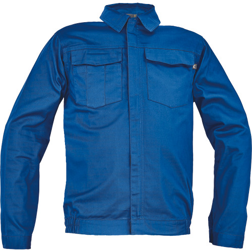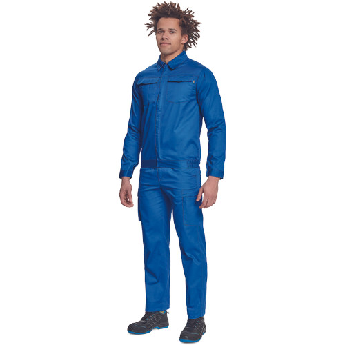 • férfi munkakabát • cipzáras, tépőzáras hajtókával • 2 nagy hajtókás mellkasi zseb • rugalmas oldalsó betétek a kabát alján • tépőzáras mandzsetta • 65% PES/35% pamut, 195 g/m2