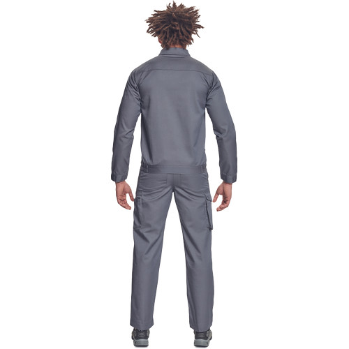• férfi munkakabát • cipzáras, tépőzáras hajtókával • 2 nagy hajtókás mellkasi zseb • rugalmas oldalsó betétek a kabát alján • tépőzáras mandzsetta • 65% PES/35% pamut, 195 g/m2