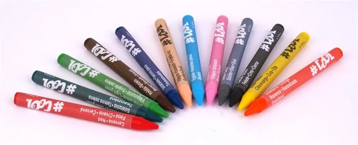 -a készletben összesen 12 db zsírkréta található: citromsárga, narancssárga, piros, világos rózsaszín, pink, égkék, sötétkék, világoszöld, sötétzöld, barna, szürke, fekete színekben