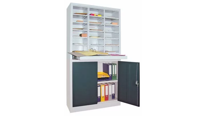 Rendezőpolc, széxméxma 1000x400x1950 mm, 3x6 rekesz, 1 kihúzható polc, 1 kétajtós szekrény 950 mm magas 1 polccal, ral 7035/5010 világosszürke/enciánkék