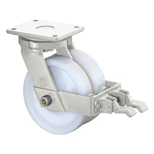 Nagy teherbírású, dupla forgóvillás görgő reteszelőszerkezettel, dupla forgóvillás görgő reteszelő mechanizmussal, fehér műanyag, 100 mm átmérő, 800 kg teherbírás, golyóscsapágy, csavaros talp