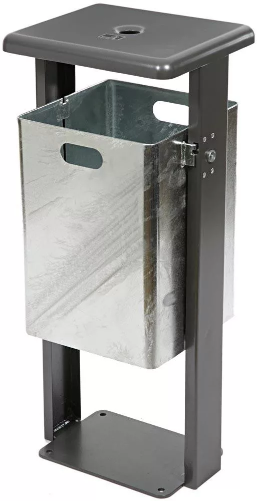Szögletes szemetes fedéllel, kb. 40 literes, tűzihorganyzott, db 703 acél fedéllel és állvánnyal, csavarozható alaplappal, hamutartós fedéllel