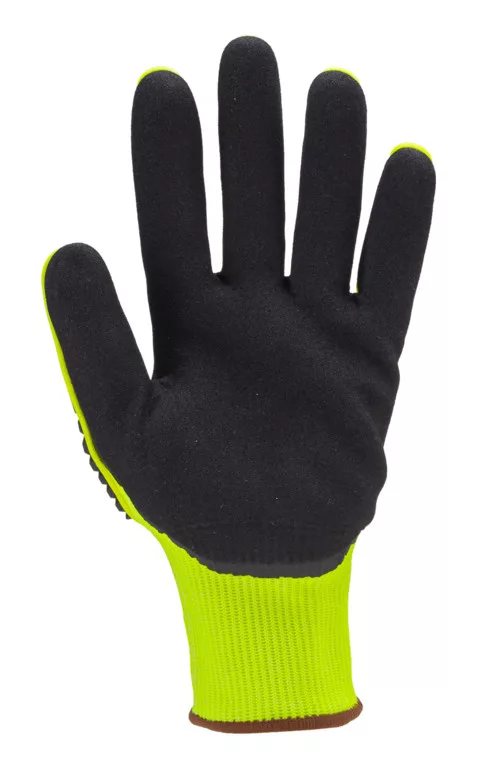 Sárga, varrás nélküli, 13-mas kötésű kesztyű HDPE-vel és poliészterrel erősítve.Duplán mártott tenyér: egy sima és egy érdesített rétegTPR erősítés az ökölcsonton és az ujjakon.Kötött mandzsetta