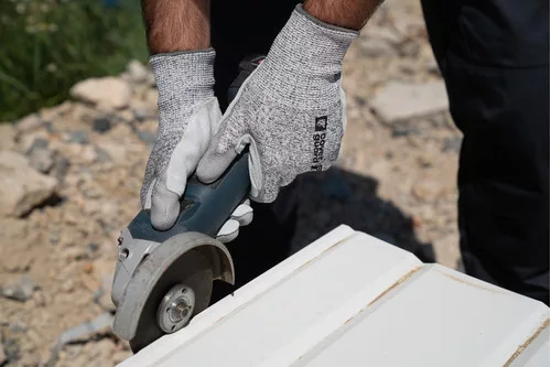 13-as kötésű, HDPE / poliészter kesztyű, tenyerén és az ujjakon szürke PU bevonat és bőr megerősítés, a hüvelykujj és a mutatóujj kivételével; Para-aramid varrás és kötött mandzsetta.