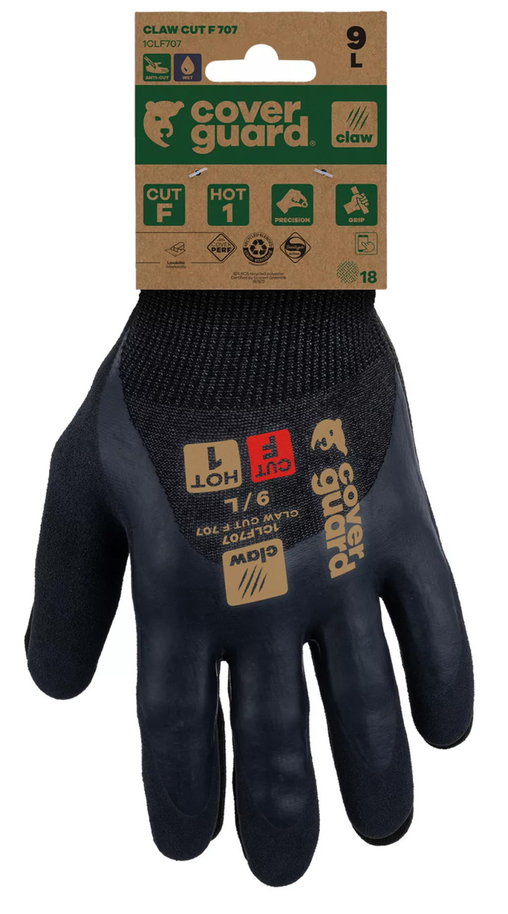 A CLAW CUT termékcsalád egy új generációs vágásálló kesztyű, amelyet a legigényesebb munkákhoz terveztek, magas vágásállósággal (CUT D-től A9-ig), és kiváló komfortot, valamint kivételes ügyességet biztosít minden munkakörnyezetben (száraz, nedves és olajos).A CLAW CUT F 707 modellt finom anyagmozgatási munkákhoz tervezték száraz és nedves környezetben. A magas 18-as kötés, amely egy rendkívül puha és erős üvegszál, poliészter és spandex alapú anyagból készült, kivételes komfortot nyújt, miközben maximális vágásvédelmet biztosít (CUT F, az EN388 szabvány szerint).A dupla rétegű latex bevonat (3/4 sima + tenyér homokszerű felülettel) vízálló, kiváló tapadást és jó fogást biztosít a legigényesebb munkák során száraz és nedves környezetben.A CLAW CUT F 707 újrahasznosított poliészterből készült, RCS tanúsítvánnyal (a termék összsúlyának 16%-a). Üvegszál nélkül.Ez a kesztyű érintőképernyő kompatibilis, így viselése közben is használhatja a képernyős berendezéseket. Sanitized kezelés: megakadályozza a baktériumok és szagok fejlődését.