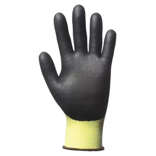 * 18-as kötésű, vágásbiztos fluo sárga HPPE + nylon + elasztán védőkesztyű * ökölcsontig fekete szellőző mikrohabosított nitrillel mártva* Ergonomikus forma,Kötött mandzsetta