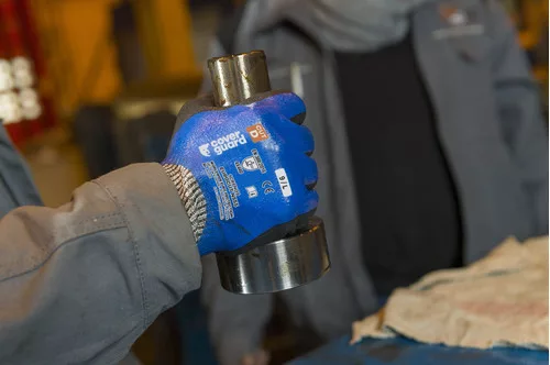 Pettyezett, szürke,13-mas kötésű varrásnélküli kesztyű. HPPE-vel, ásványi szálakkal, poliamiddal és elasztánnal erősítve.Duplán mártott nitril tenyér: egy réteg sima kék, egy érdesített fekete.Ergonómikus kialakítás.Kötött mandzsetta
