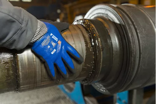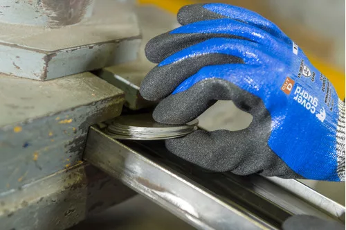 Pettyezett, szürke,13-mas kötésű varrásnélküli kesztyű. HPPE-vel, ásványi szálakkal, poliamiddal és elasztánnal erősítve.Duplán mártott nitril tenyér: egy réteg sima kék, egy érdesített fekete.Ergonómikus kialakítás.Kötött mandzsetta