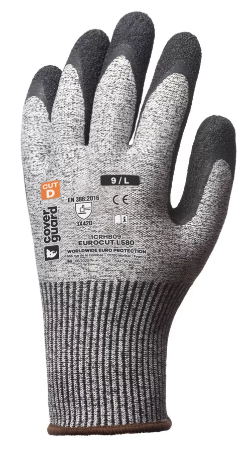 * 13-as kötésű, legmagasabb szintű szakítás elleni védelemmel rendelkező, illetve TDM D szinten vágásbiztos HPPE+ ásványi szál + poliamid alapanyagú védőkesztyű* tenyerén fekete krepp latex mártott védőkesztyű* könnyű, extra kényelmes, teljesen kézre simuló formai kialakítás, extra csúszásbiztossággal száraz és nedves környezetben* gumírozott, rugalmas mandzsetta