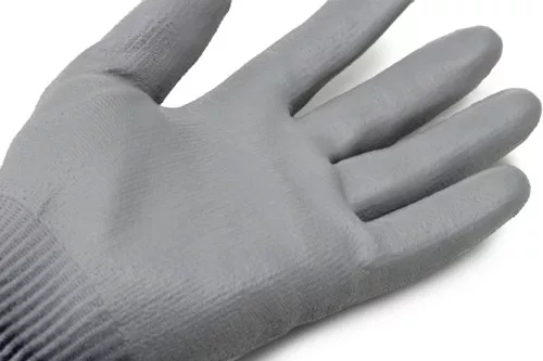 Szürke, 18-as kötésű varrás nélküli kesztyű, HDPE, poliamid, elasztán alapanyagból, tenyerén szürke poliuretán mártás, érintőképernyőhöz használható, kötött mandzsetta.