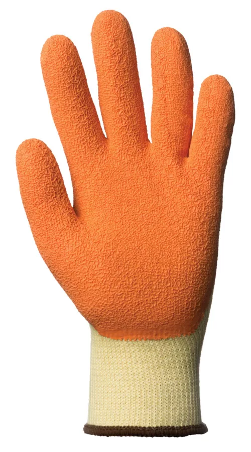 Sárga, varrás nélküli, poliészterrel megerősített, 10-es kötésű, kötött mandzsettájú kesztyű. Narancs színű érdesített latex tenyér mártás.