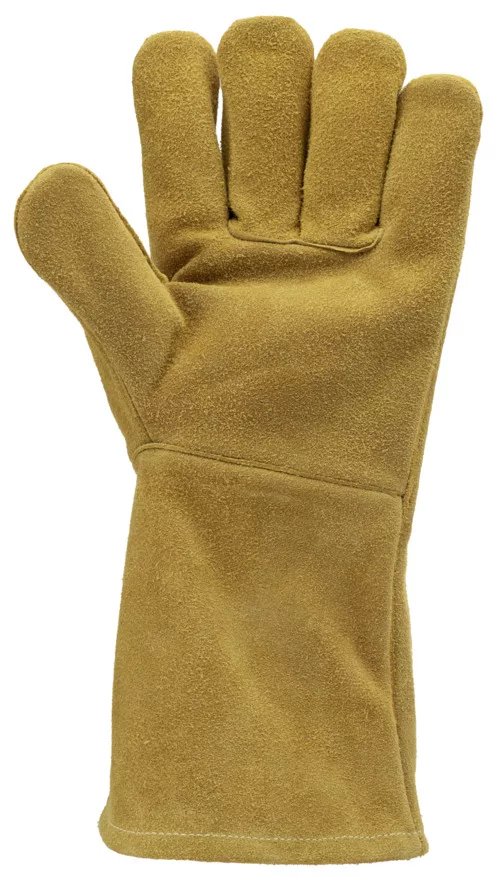 Arany színű marhahasíték hegesztő védőkesztyű Kevlar® cérnával Vastag hőszigetelő polár béléssel5 cm hosszú, hasított bőr biztonsági mandzsetta