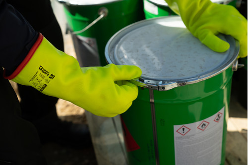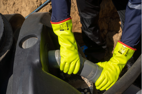 Nejlon varrás nélküli alapkesztyű Végig mártva sárga PVC-vel és a tenyerén csúszásbiztos szemcsés bevonat Hosszú egyenes mandzsetta: teljes hossz 35 cmFertőtlenített