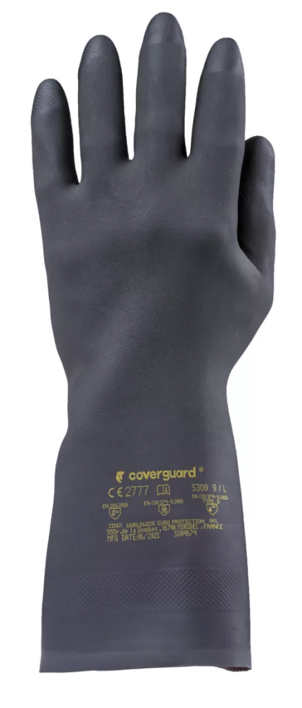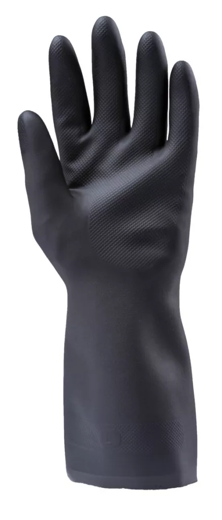 Fekete polikloroprén és természetes gumi védőkesztyűPamutbolyhozott belső, 0,7 mm vastag, 31 cm hosszúHosszú, egyenes mandzsettaCsúszás ellen érdesített tenyér