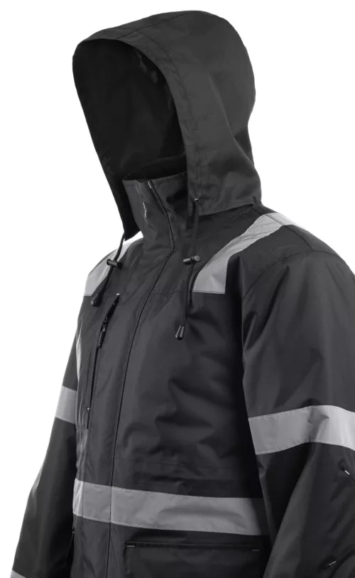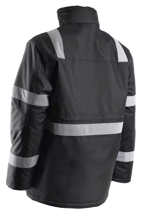 Securite fekete télikabát fényvisszaverő csíkokkal* Oxford: PU-val mártott 100% 300D Oxford PES + 160 g/m2 vastag melegbélés + fényvisszaverő csíkok* Hegesztett varrás* Állítható derék és mandzsetta* Szélálló mandzsetta* Polár béléses gallér* Dupla hajtókával fedett cipzár* Gallérba rejtett kapucni* Előformázott könyökrész* 8 zseb* Varrott fényvisszaverő csíkok* Szitázható