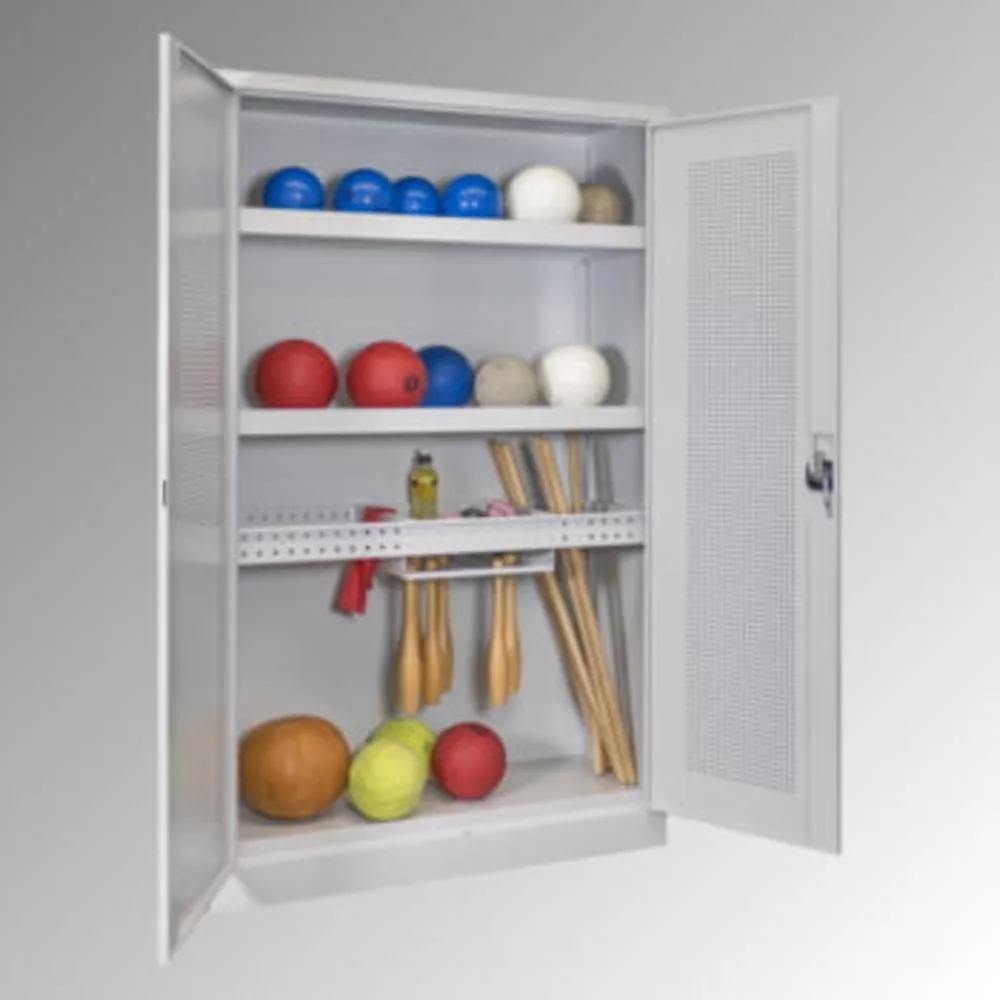 Labdaszekrény perforált fémajtókkal, széxméxma 1200x500x1950 mm, 2 polc, 2 hosszanti és 2 kereszttartó, elválasztóval, ütőtartóval, zárral, ral 7035