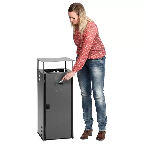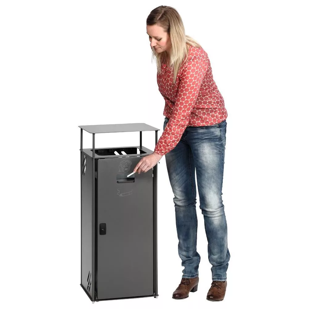 3 mm-es horganyzott acélból készült hamutartós szemetes, porszórt, zárható, horganyzott. belső vödör térfogata 51 l, széxméxma 400x400x900 mm, oldalak vas csillámpor
