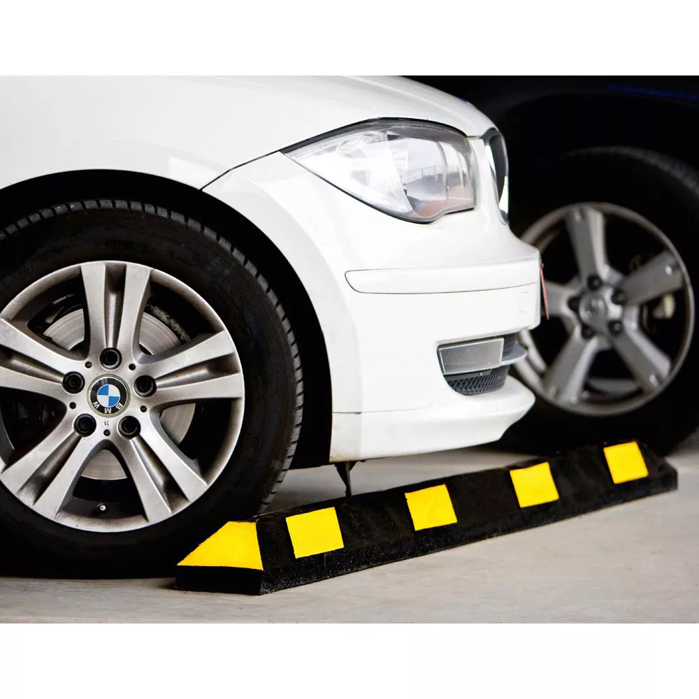 1. Parkolókorlát, fekete-fehér színben. újrahasznosított gumiból, fényvisszaverő csíkokkal.