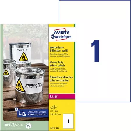 Etikett, 210x297 mm, poliészter, időjárásálló, AVERY ZWECKFORM, fehér, 100 etikett/csomag