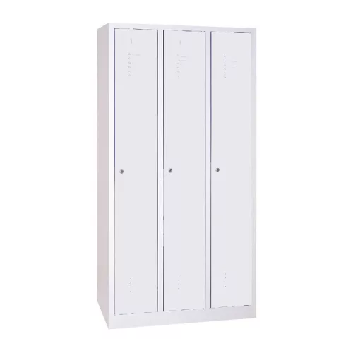 Keskenyajtós acél öltözőszekrény, 3 rekeszes, kalaptartó-polccal, alatta fogastartó-rúddal, hengerzárral vagy lakatpánttal, zárt aljjal.