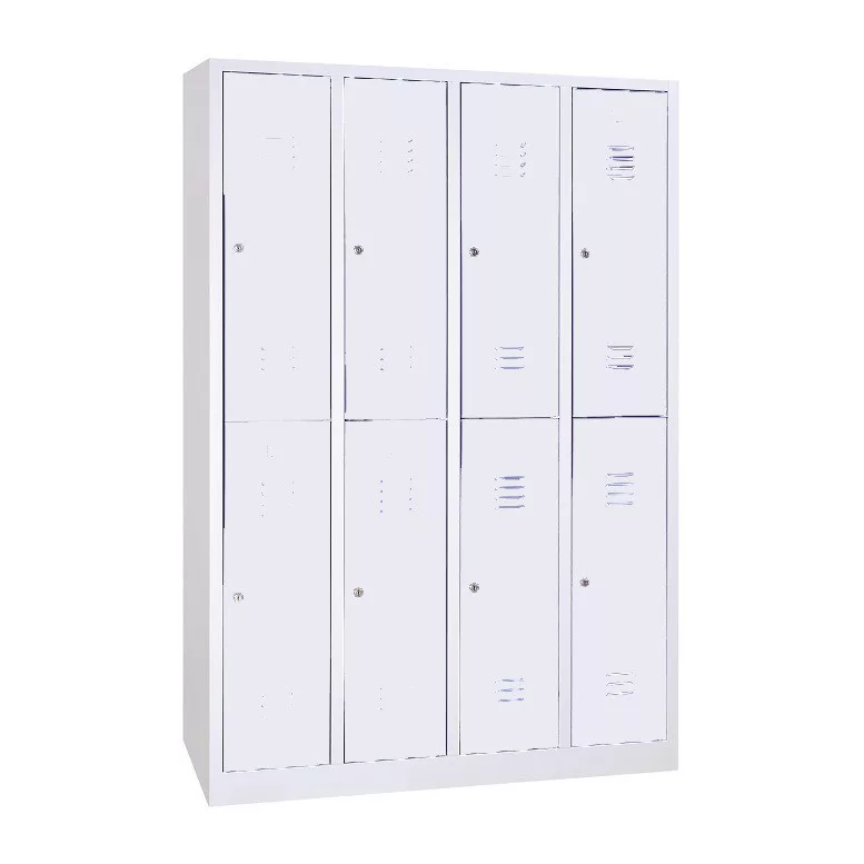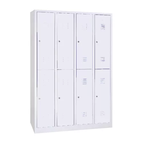 Rövidajtós acél öltözőszekrény, 8 rekeszes, kalaptartó-polccal, alatta fogastartó-rúddal, hengerzárral vagy lakatpánttal, zárt aljjal.