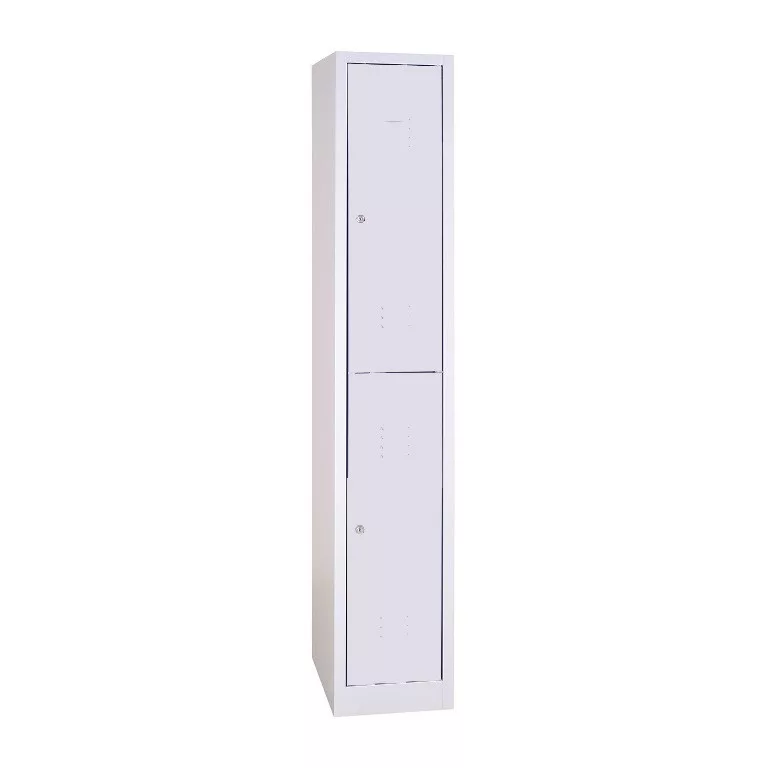 Rövidajtós acél öltözőszekrény, 2 rekeszes, kalaptartó-polccal, alatta fogastartó-rúddal, hengerzárral vagy lakatpánttal, zárt aljjal.