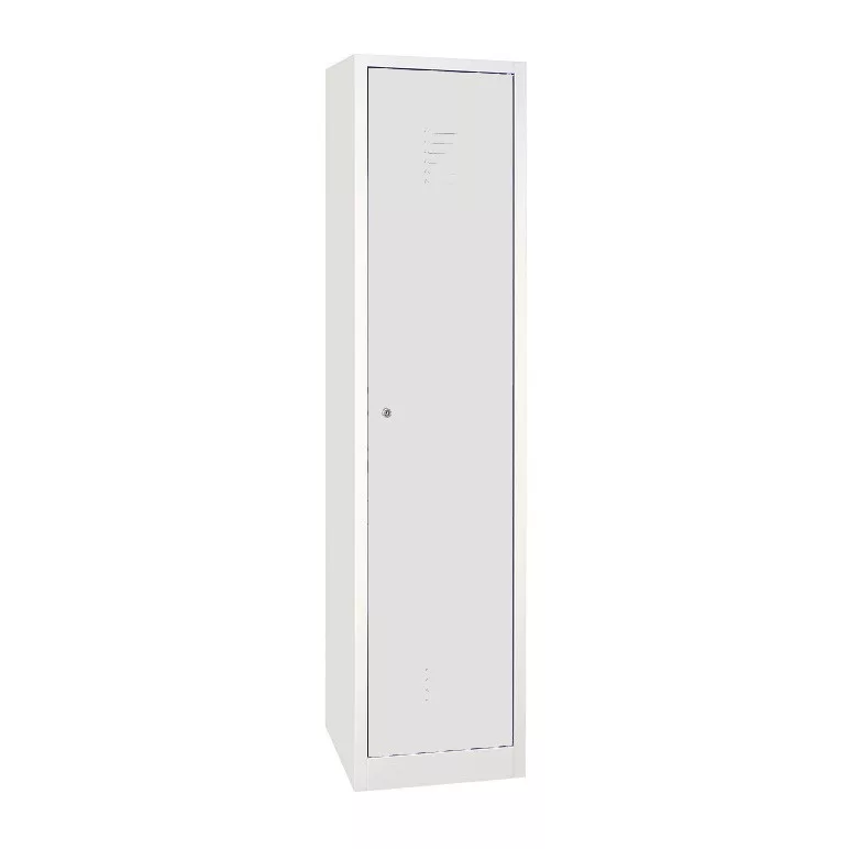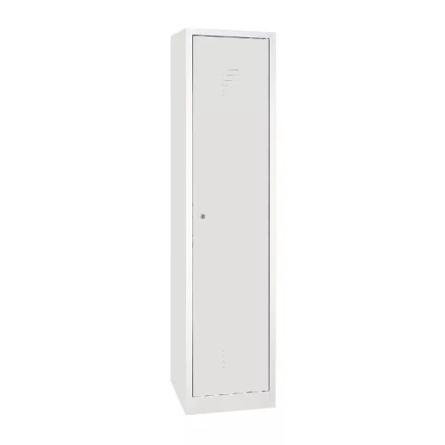 Szélesajtós acél öltözőszekrény, 1 rekeszes, válaszfal nélkül, kalaptartó-polccal, alatta fogastartó-rúddal, hengerzárral vagy lakatpánttal, zárt aljjal.