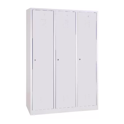 Szélesajtós acél öltözőszekrény, 3 rekeszes, válaszfal nélkül, kalaptartó-polccal, alatta fogastartó-rúddal, hengerzárral vagy lakatpánttal, zárt aljjal.