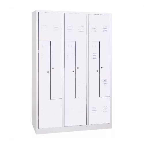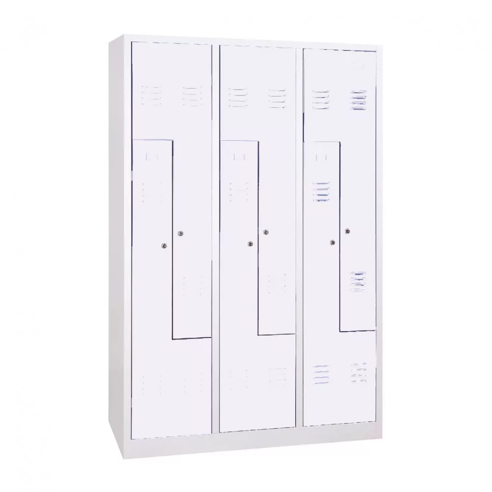 Z-ajtós acél öltözőszekrény, 6 rekeszes, kalaptartó-polccal, alatta fogastartó-rúddal, hengerzárral vagy lakatpánttal, zárt aljjal.