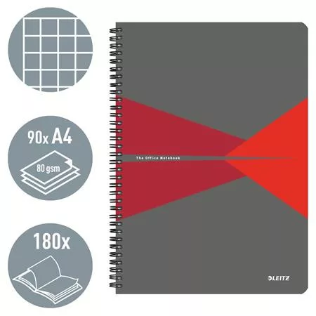 Spirálfüzet, A4, kockás, 90 lap, laminált karton borító, LEITZ "Office", szürke-piros