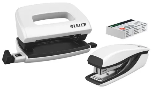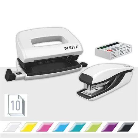 Tűzőgép és lyukasztó szett, 10 lap, fém, LEITZ "Wow Mini", fehér