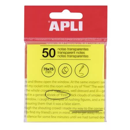 Öntapadó jegyzettömb, átlátszó, vízálló, 75x75 mm, 50 lap, APLI, sárga