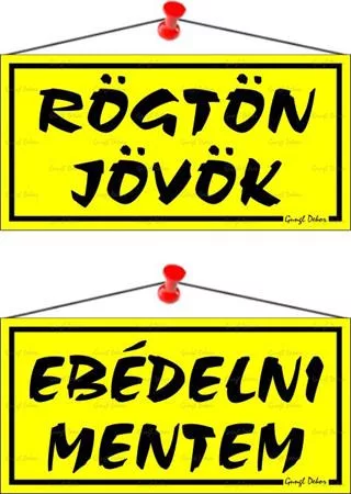 Információs tábla, 20x10,5 cm, kétoldalas, "Rögtön jövök/Ebédelni mentem", sárga