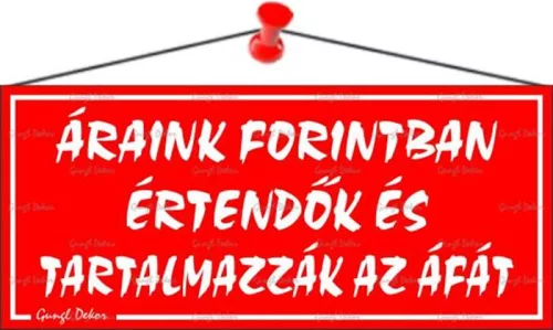 Információs tábla, 22,5x10 cm, "Áraink forintban értendők és tartalmazzák az áfát", piros