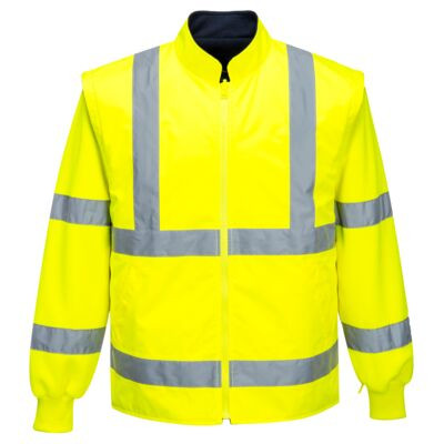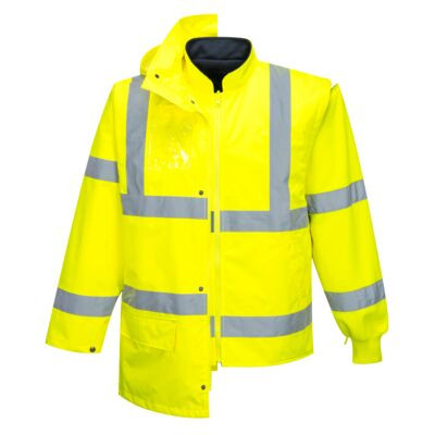 Kiváló ár-érték arányt képviselő 5 az 1-ben kabát. Külső kabáton praktikus tárolózsebek, állítható mandzsetta és rejtett kapucni található. A belső kabát levehető, fluoreszkáló polár ujjakkal és két tárolózsebbel rendelkezik. EN ISO 20471 maximális Class 3 szabvány szerint minősítve.