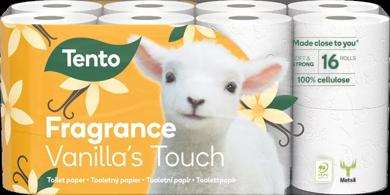 Tento Fragrance Vanilla's Touch toalettpapír gyengéd vaníliaillattal. Kiváló minőségű toalettpapír. Megbízható erősség, gyengéd puhaság - hogy a mindennapokban is biztos és kényelmes választás legyen. PEFC- és FSC-tanúsítvánnyal rendelkezik.