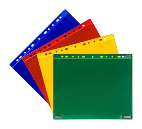 Színes perforált tasak az információk LEAN tematikus megjelenítéséhez ipari környezetben.